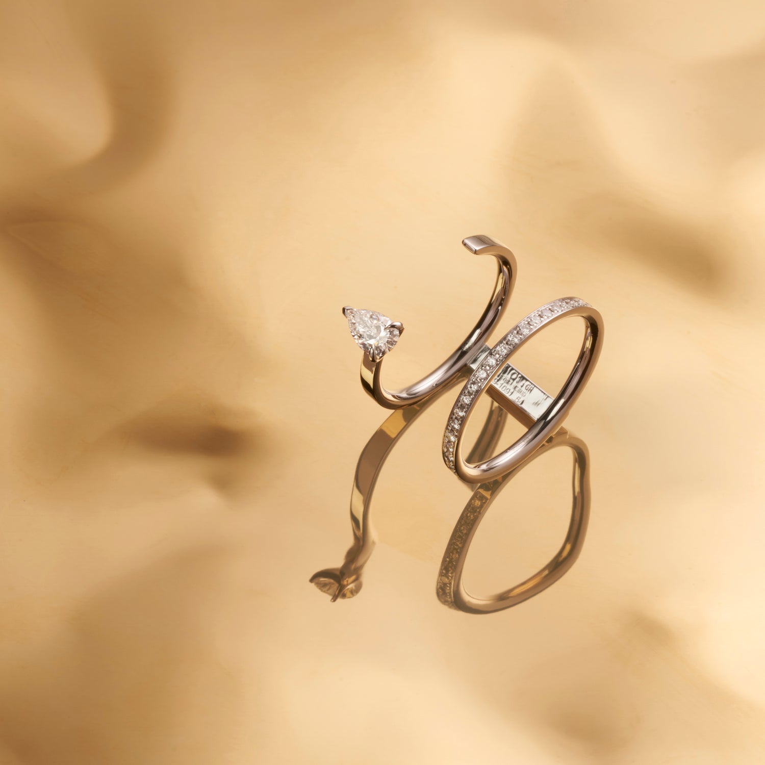 Serti sur Vide Ring with 2 pear shaped diamonds and 1 pear shaped emerald