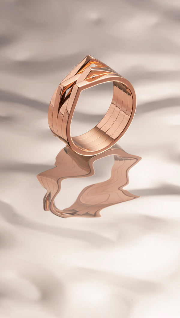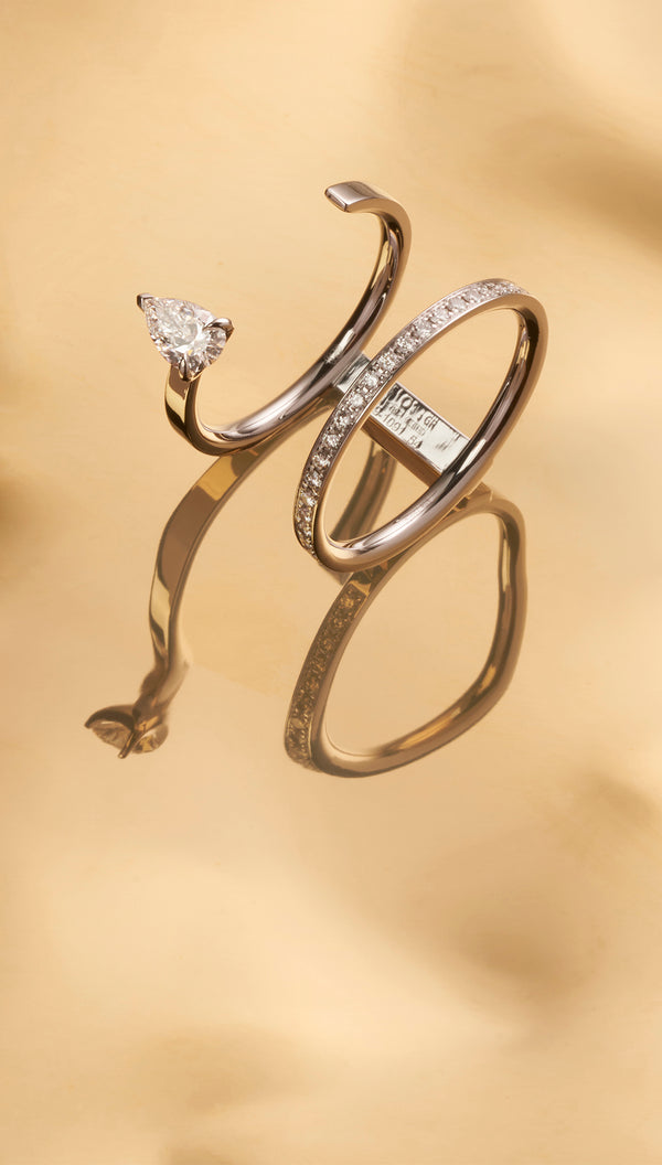Antifer reinterprets the classic ring through the meeting of the round and the point, subtly superimposed in an asymmetrical architectural composition.