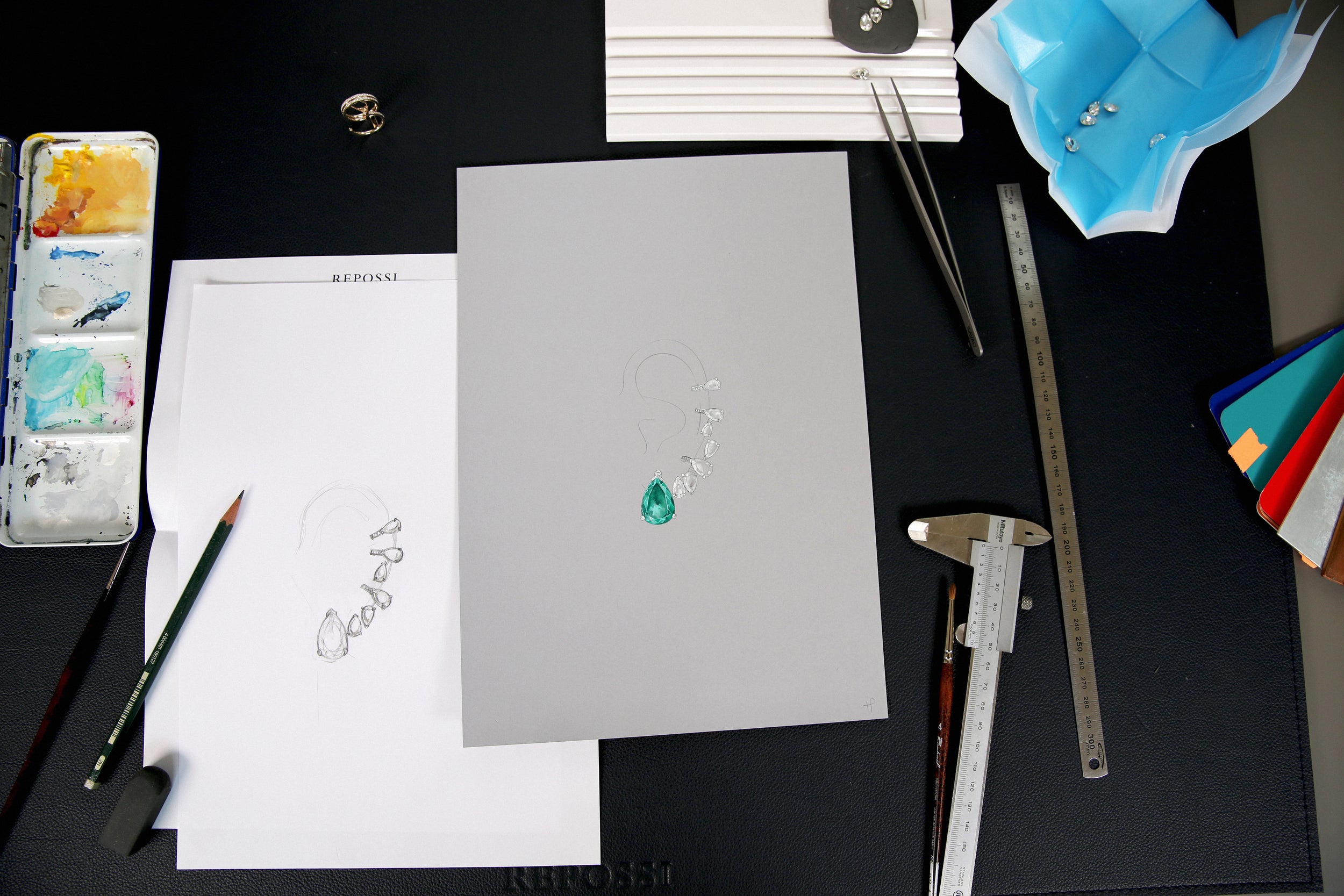 The Emerald Serti sur Vide earcuff is a reinterpretation of the traditional chandelier earring, crafted from a composition of exceptional stones, each meticulously selected to ensure a harmonious effect. Each stone is arranged to follow the natural curve of the ear, creating an ascending line of light. A true masterpiece, this piece showcases the traditional craftsmanship and excellence of our historic ateliers. The stones are highlighted by our unique "Eiffel Tower" setting, enhancing their natural beauty and brilliance.