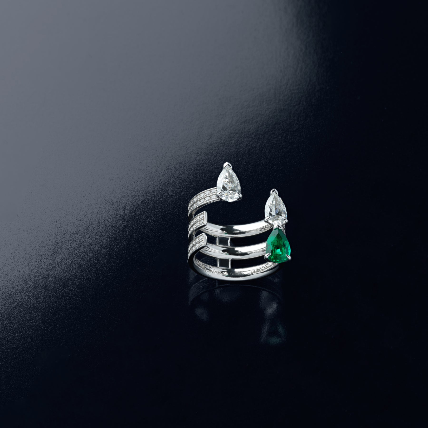 Repossi reinvents the traditional diamond river into a choker that combines minimalism with technical mastery. Composed of a flexible titanium cable within a gold structure, this choker stands out for its flexibility, offering both comfort and lightness when worn. Enhanced by an emerald paired with a diamond, the architectural setting subtly recedes to highlight the stones, creating the illusion of floating gems.