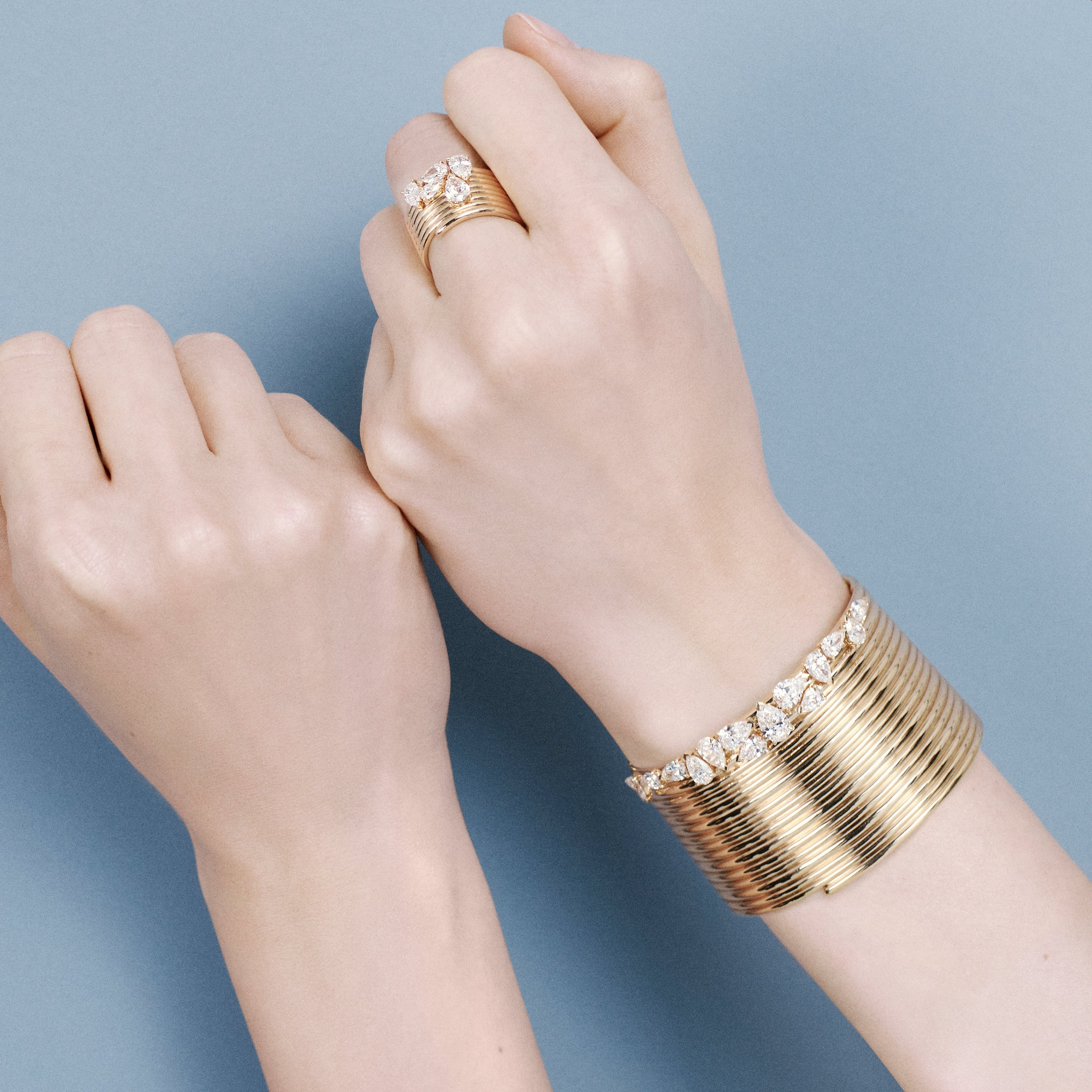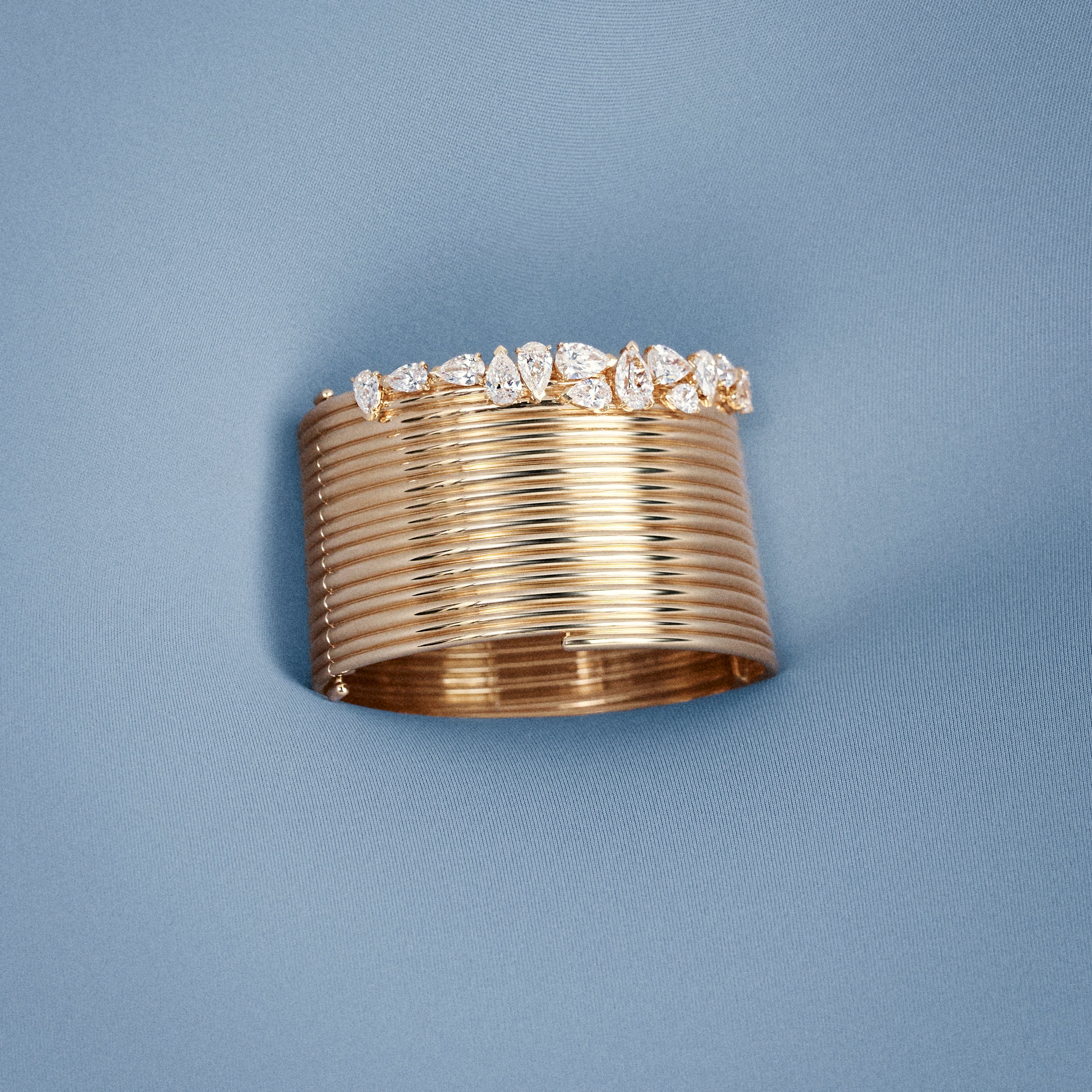 La manchette Blast de Repossi est une pièce saisissante qui réinterprète les bijoux traditionnels Masaï avec une touche de modernité. Réalisé à partir de fils d'or soigneusement accumulés, ce bracelet arbore une élégance forte qui met en valeur les contours naturels du poignet. Inspirée des emblématiques manchettes Masaï, elle présente des fils d’or de diamètres différents, créant l'illusion d'une spirale dorée sans fin qui s'enroule harmonieusement autour du poignet. Chaque diamant est soigneusement sélectionné pour garantir une harmonie parfaite, mettant en valeur l'éclat et la beauté des pierres. Ce bracelet est une pièce d'affirmation audacieuse, une ode à la grâce et aux mouvements naturels du corps.