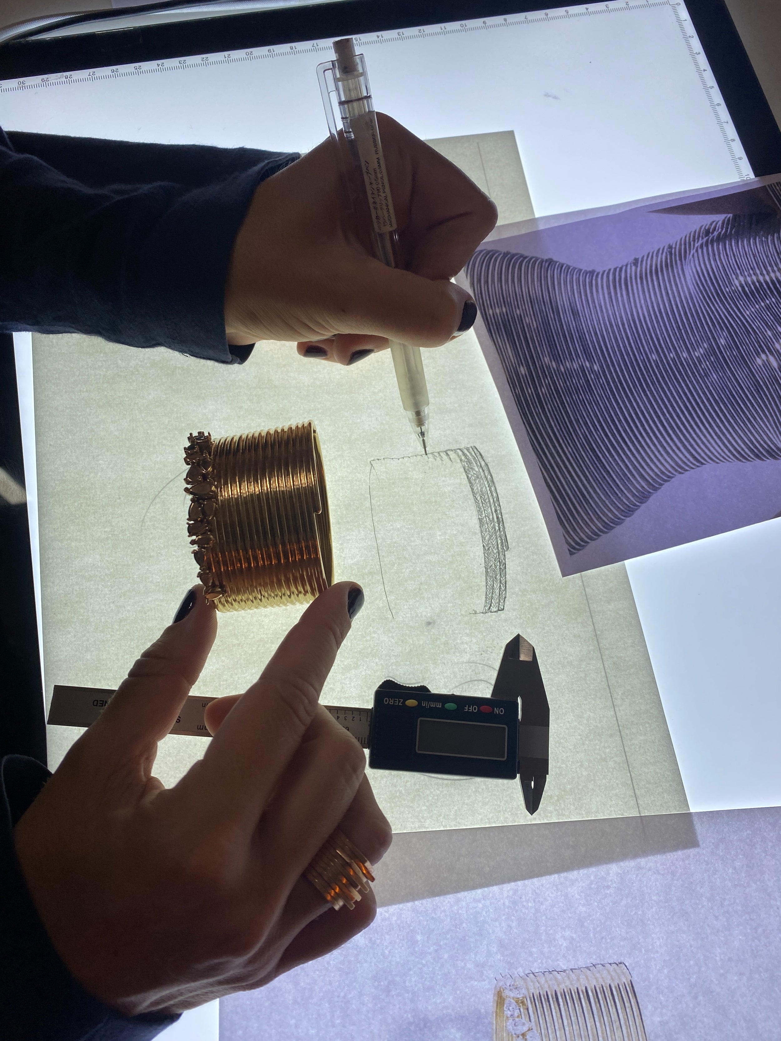 Le collier Plastron est la pièce maîtresse de la collection. Cette pièce d'exception résulte d'un processus d'assemblage méticuleux, démontrant le fil d'or caractéristique tout en assurant un confort remarquable et une tenue parfaite sur le cou. Sa création a nécessité 250 heures de travail de la part de l'atelier.