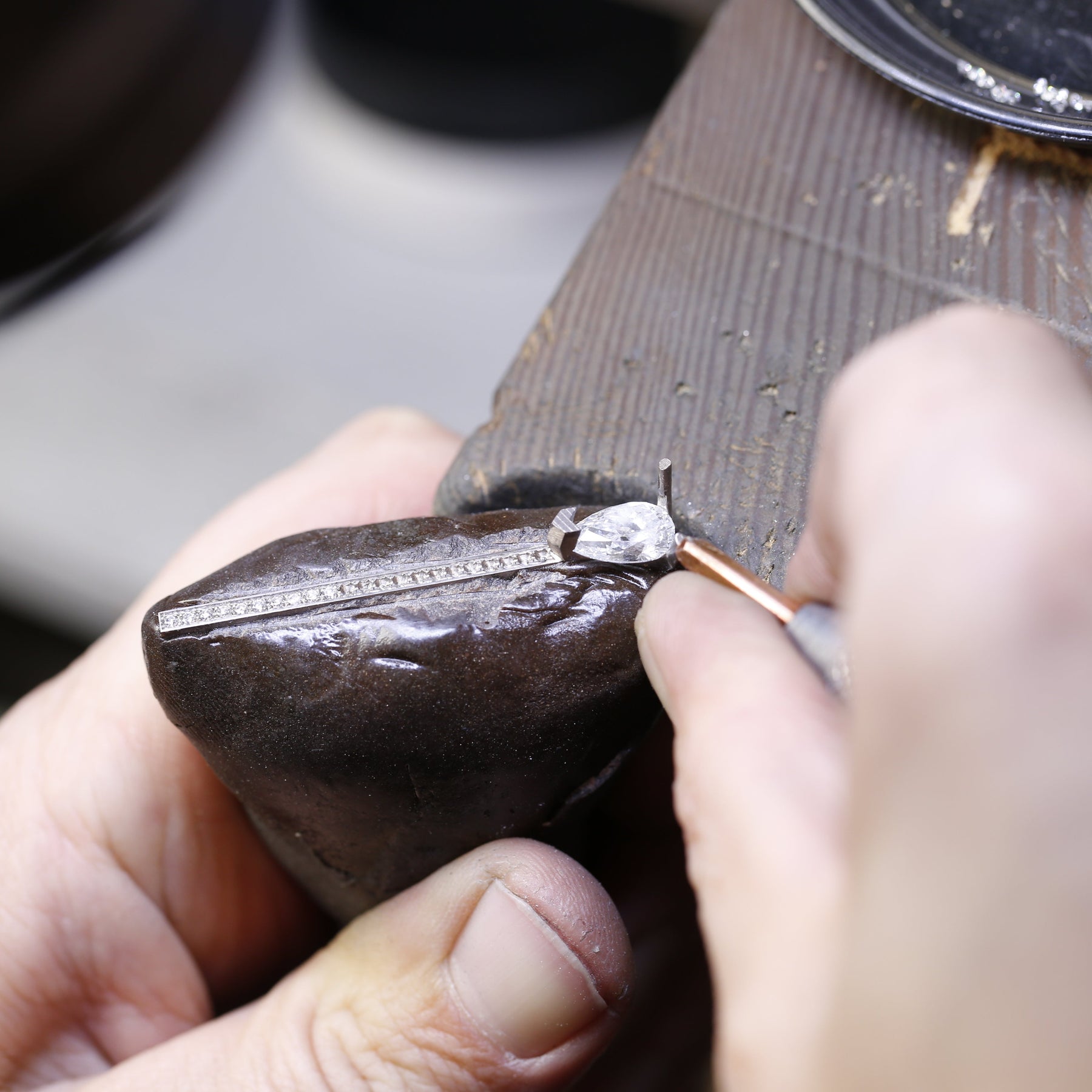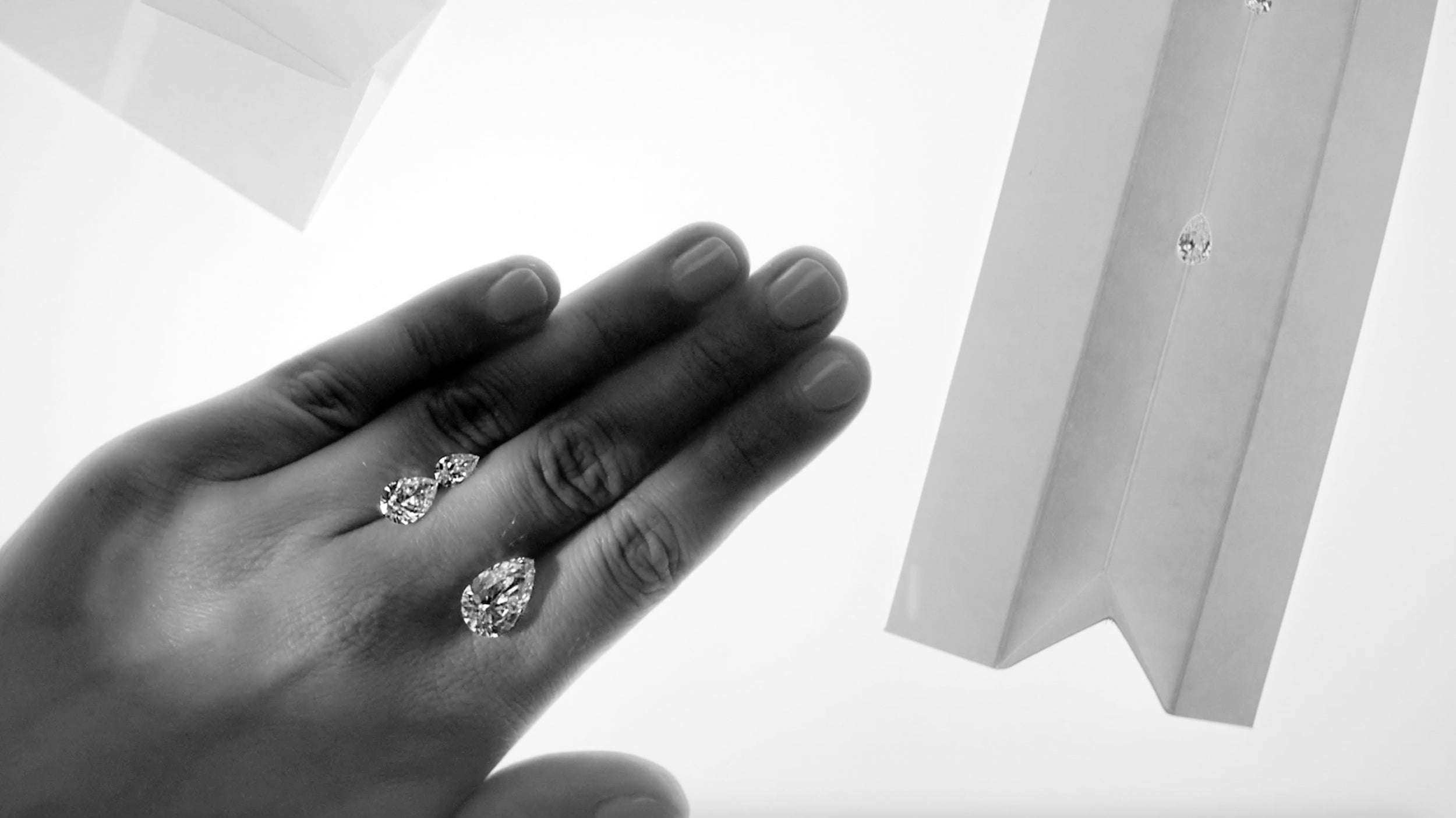 La sublimation de la taille poire est mise en scène de manière unique, créant une illusion de lévitation, grâce à un serti unique dit « Tour Eiffel », témoignant de l’expertise technique de la Maison. Ce type de chaton, qui utilise très peu de matière, permet à la lumière de rentrer sur toutes les facettes de la pierre précieuse et sublime l’éclat de cette dernière à l’inverse des sertis clos plus traditionnels.