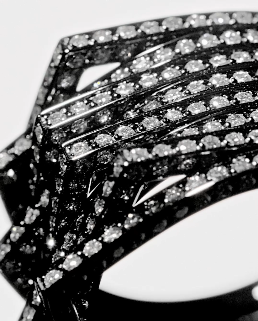 L'or noir est une véritable signature maîtrisée par seulement quelques ateliers ; l'utilisation du ruthénium est assez rare dans l'industrie. Il s'agit d'une surface en or blanc (18 ct) recouverte de ruthénium. Cette finition offre une teinte audacieuse et unisexe qui rehausse le diamant.
