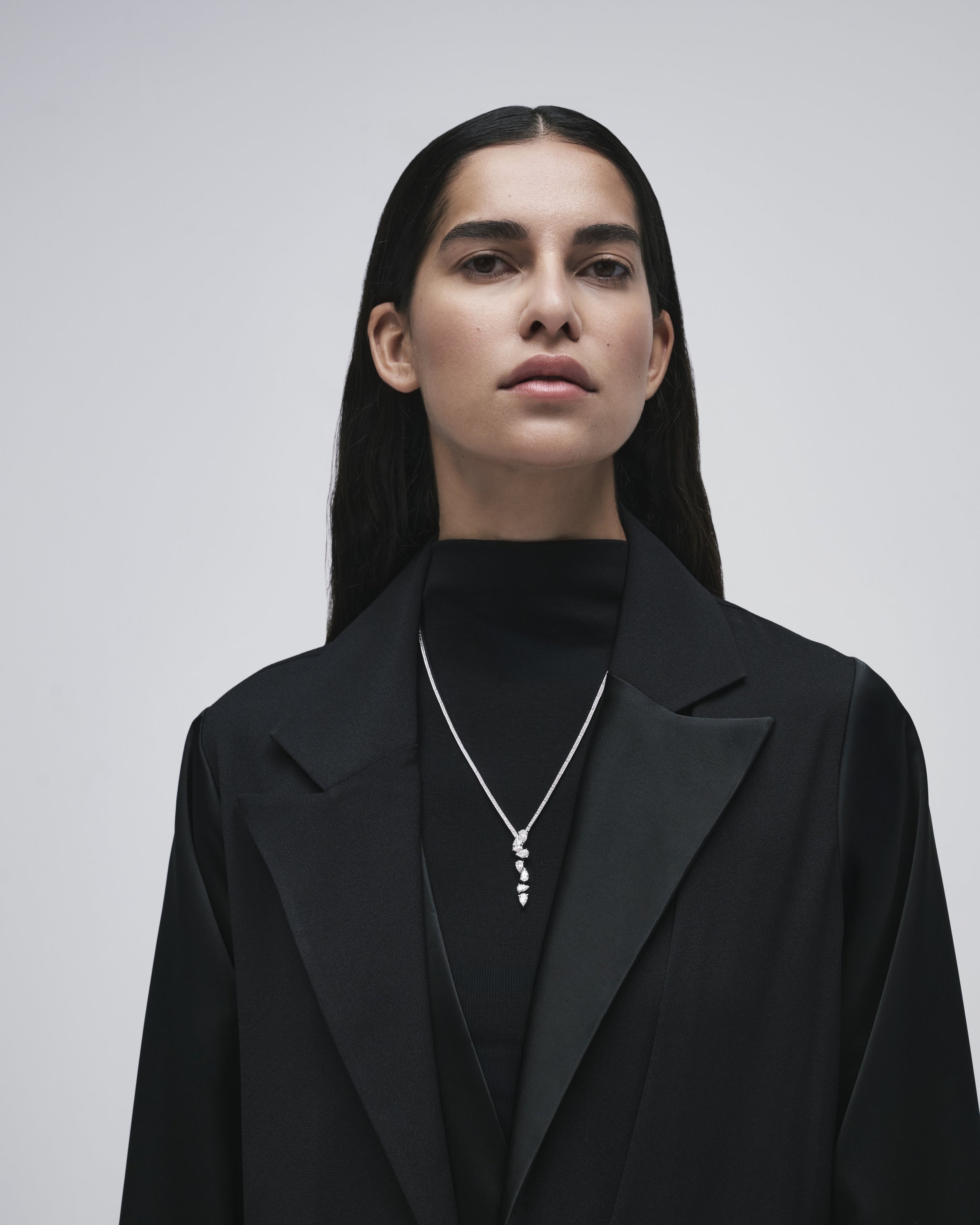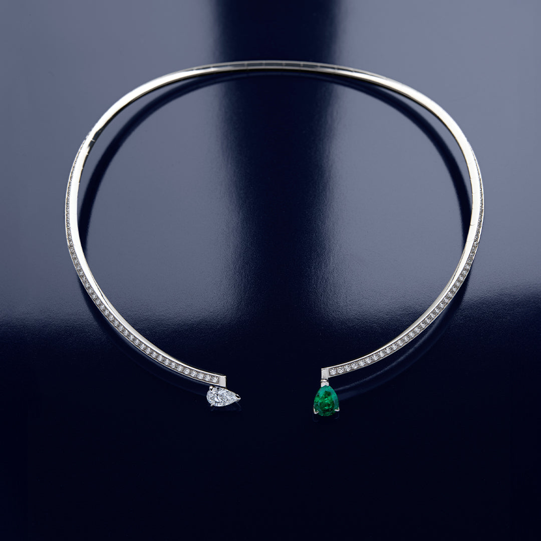 Repossi réinvente la traditionnelle rivière de diamants en un choker alliant minimalisme et technicité. Composé d’un câble en titane flexible à l’intérieur d’une structure en or, ce choker se caractérise par sa flexibilité, apportant confort et légèreté au porté.