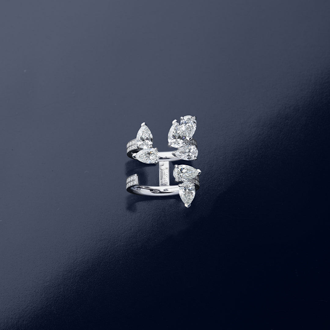 Inspirée des archives et des créations emblématiques d'Alberto Repossi, cette bague rend hommage aux Néo-Portés de la Maison en soulignant l'effet de flottement du diamant.