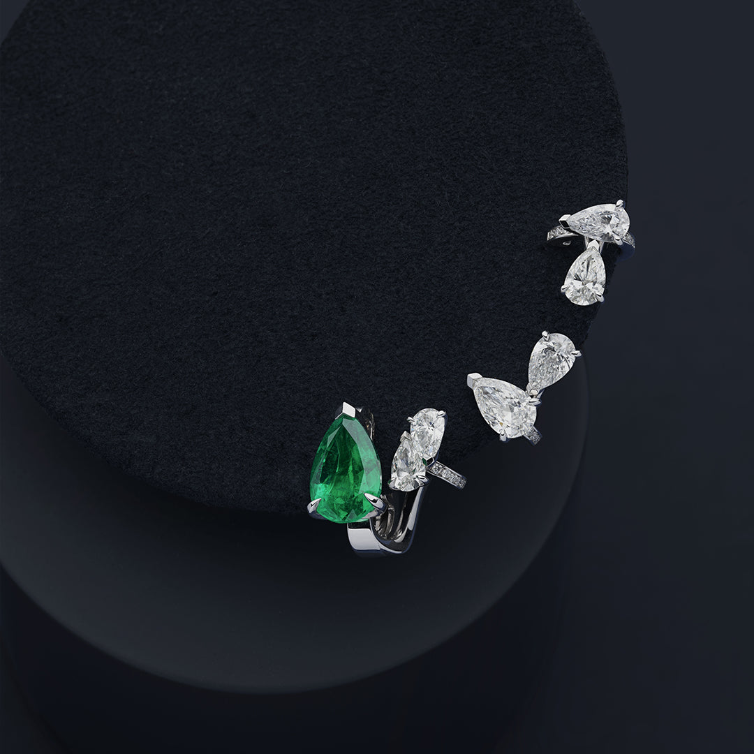 L’earcuff émeraude Serti sur Vide est une réinterprétation de la traditionnelle boucle d’oreille chandelier, formée d’une composition de pierres exceptionnelles, chacune méticuleusement sélectionnée afin de garantir un effet harmonieux. Chaque pierre est disposée afin de suivre la courbe naturelle de l’oreille, créant un trait de lumière ascendant. Véritable chef-d'œuvre, cette pièce témoigne du savoir-faire traditionnel et de l'excellence de nos ateliers historiques. Les pierres sont mises en valeur par notre chaton « tour Eiffel » unique, qui rehausse leur beauté et leur luminosité naturelles.