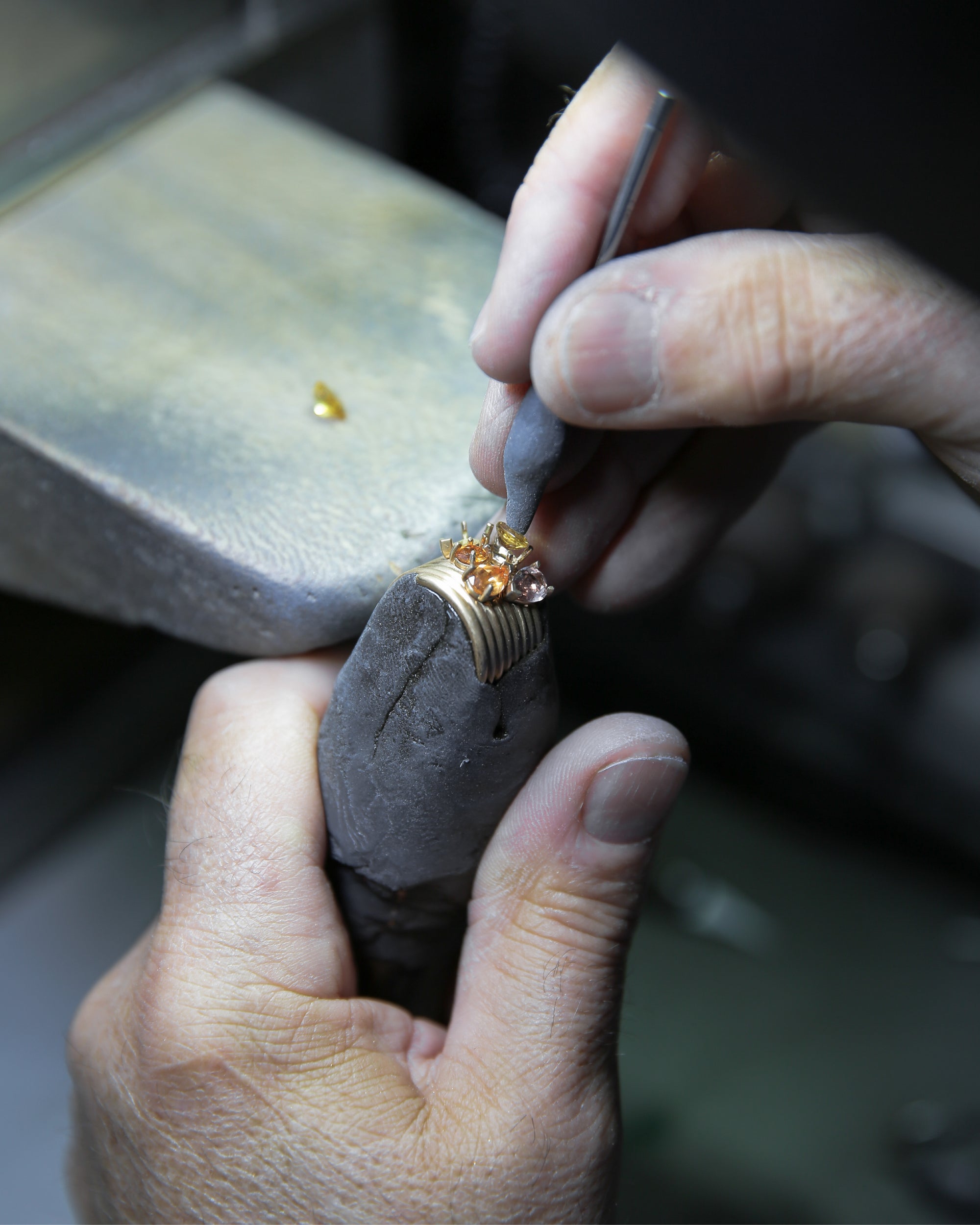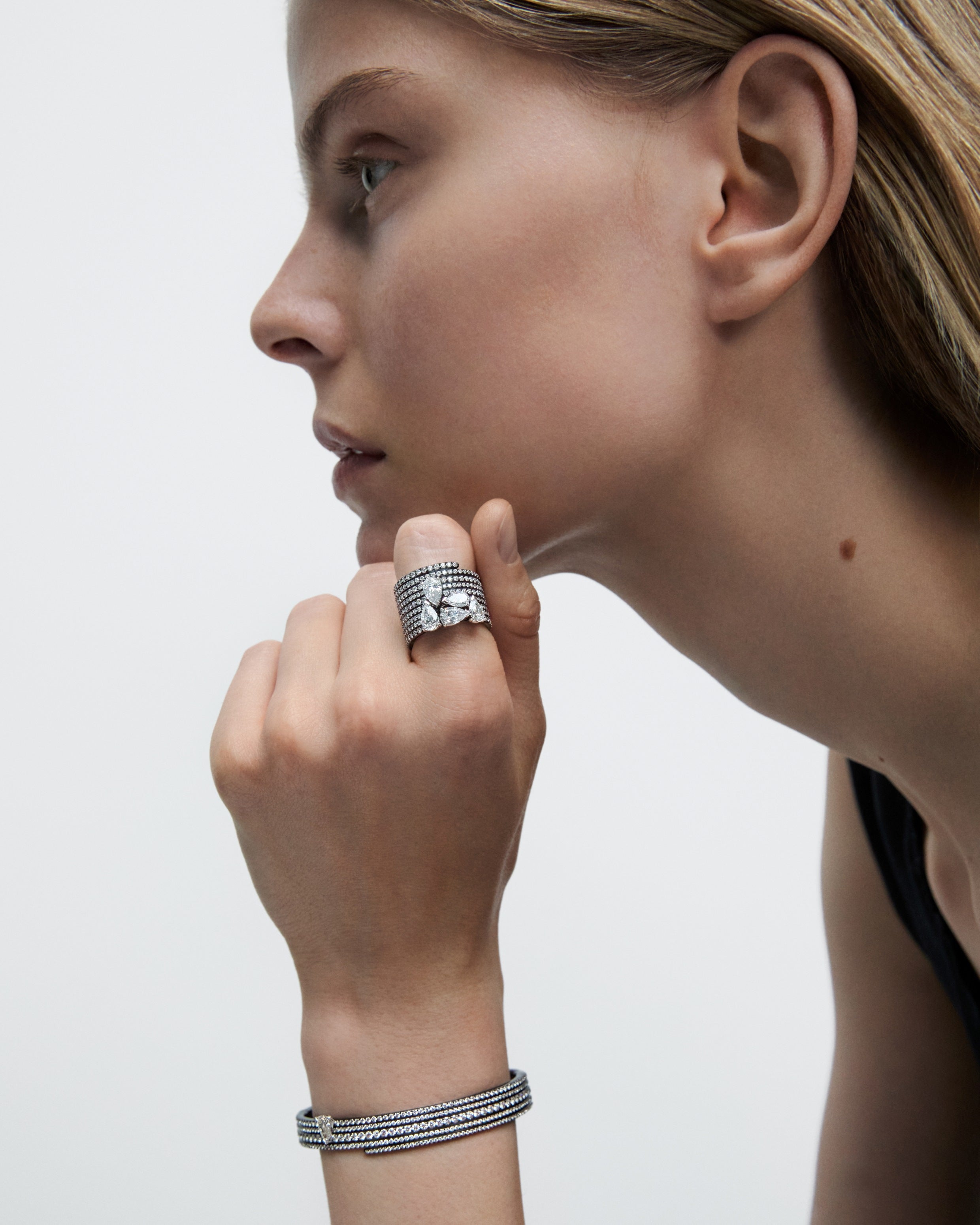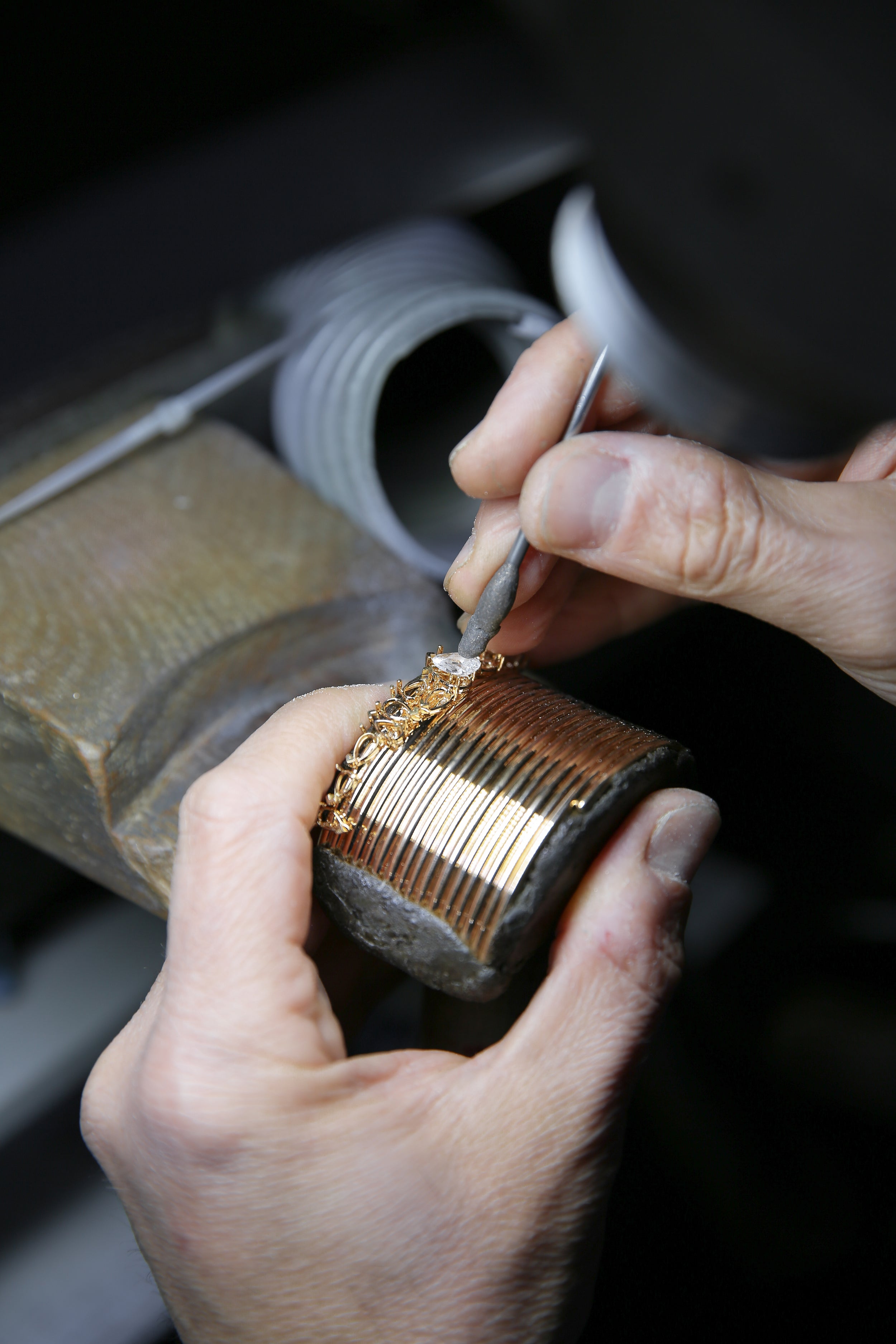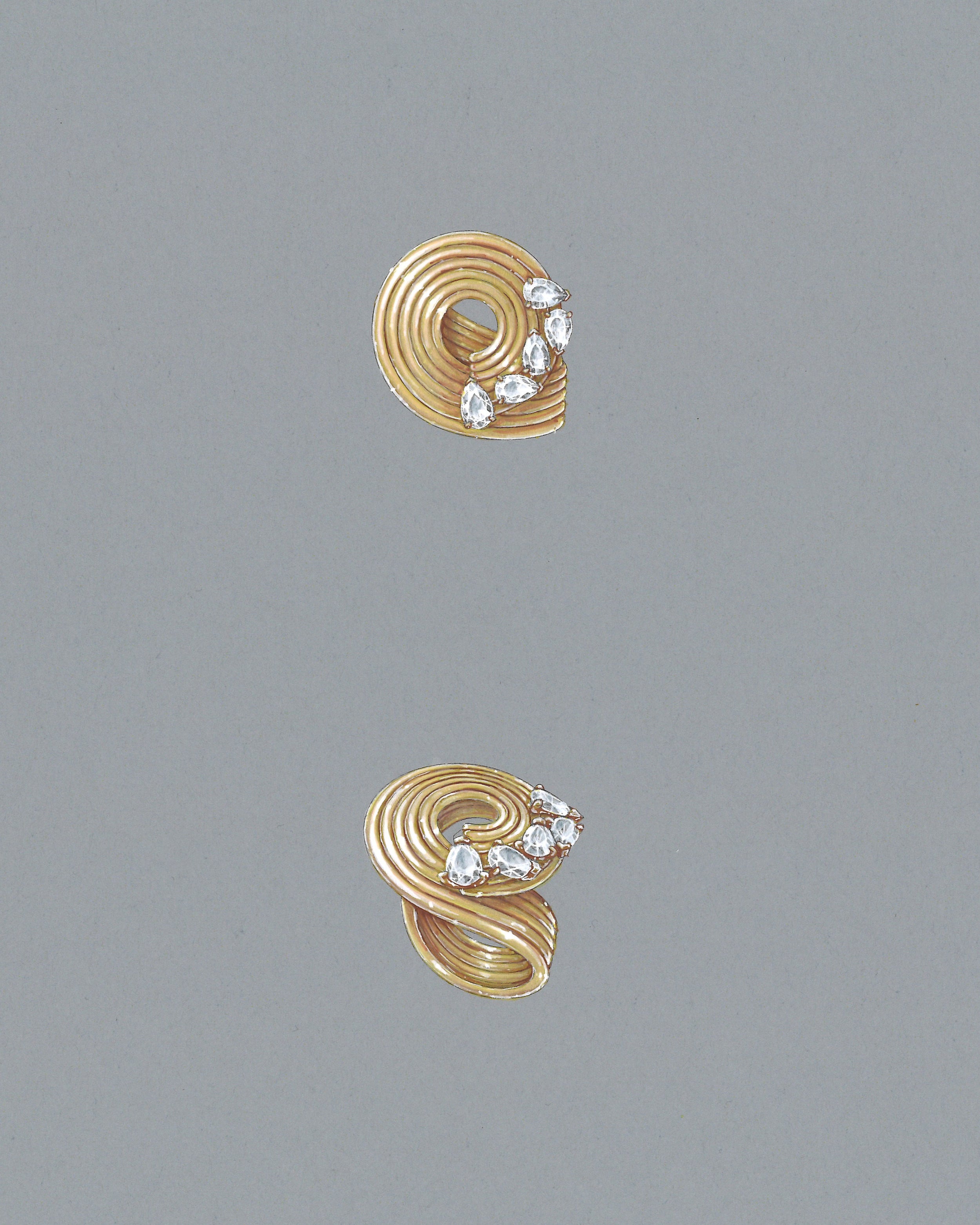 The pieces in the Blast collection are made from gold threads, enhanced by a mirror polish that highlights their unique movement and accentuates the reflection of light across the entire surface of the gold. The natural spiral shape elongates lines while following the movements of the body. Each piece in this collection is entirely crafted using the lost-wax casting technique and features pear-shaped gemstones. Positioned individually or in compositions, the stones are selected according to very strict criteria to create perfect harmony with each design.