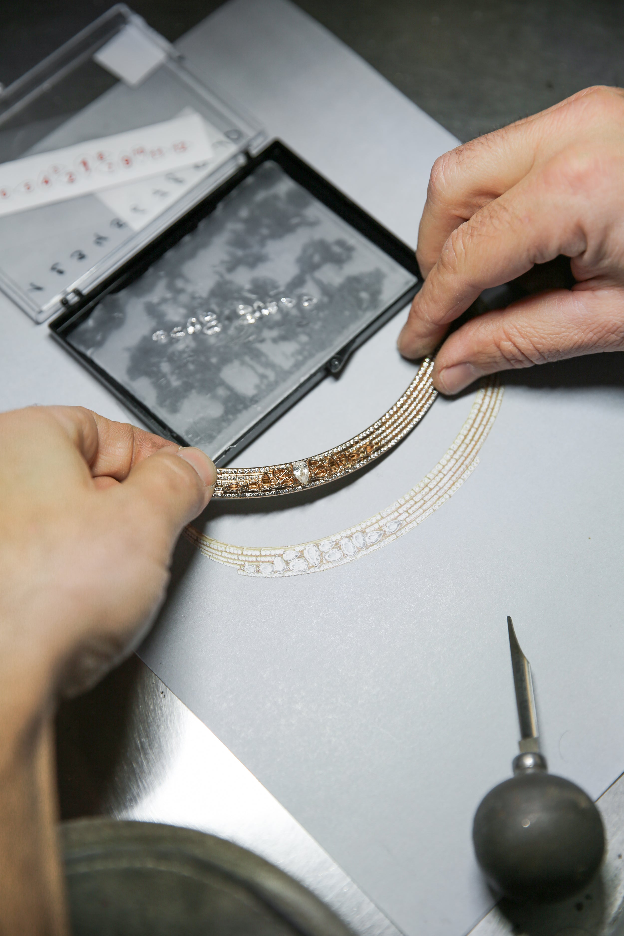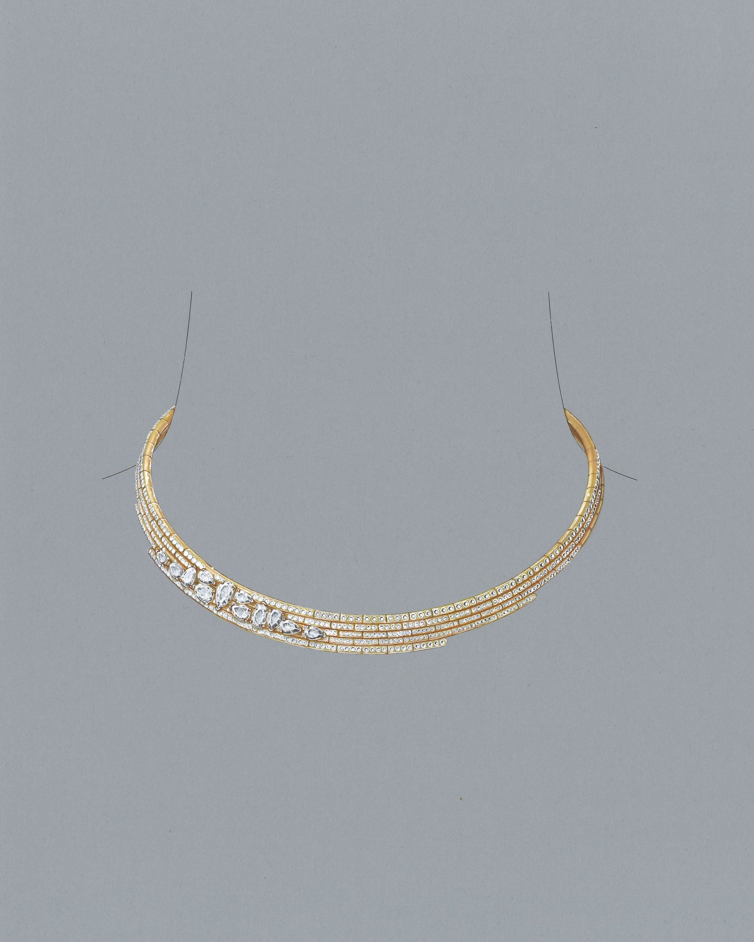 This exceptional piece results from an optimized assembly process, preserving the signature gold thread while ensuring both remarkable comfort and a perfect fit on the neck. Its creation demanded 250 hours of meticulous work by the workshop.