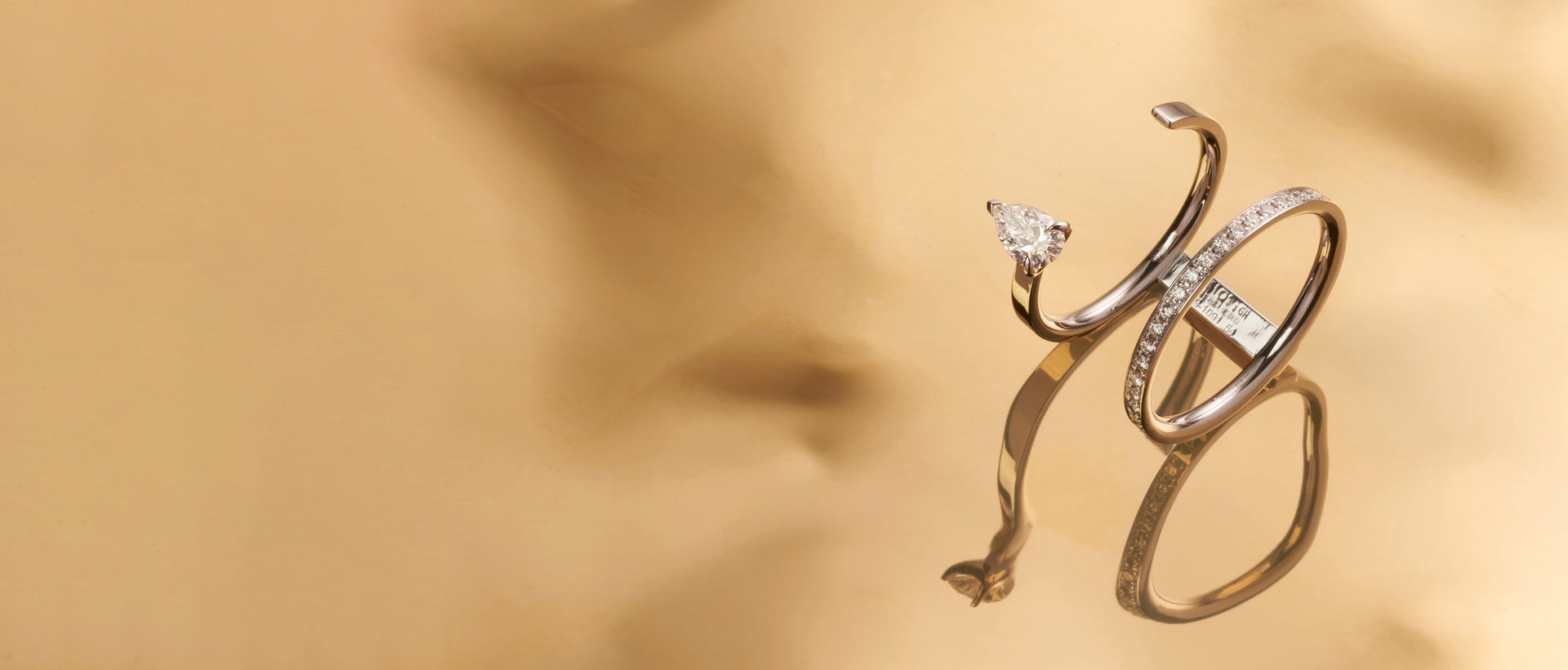 Antifer reinterprets the classic ring through the meeting of the round and the point, subtly superimposed in an asymmetrical architectural composition.