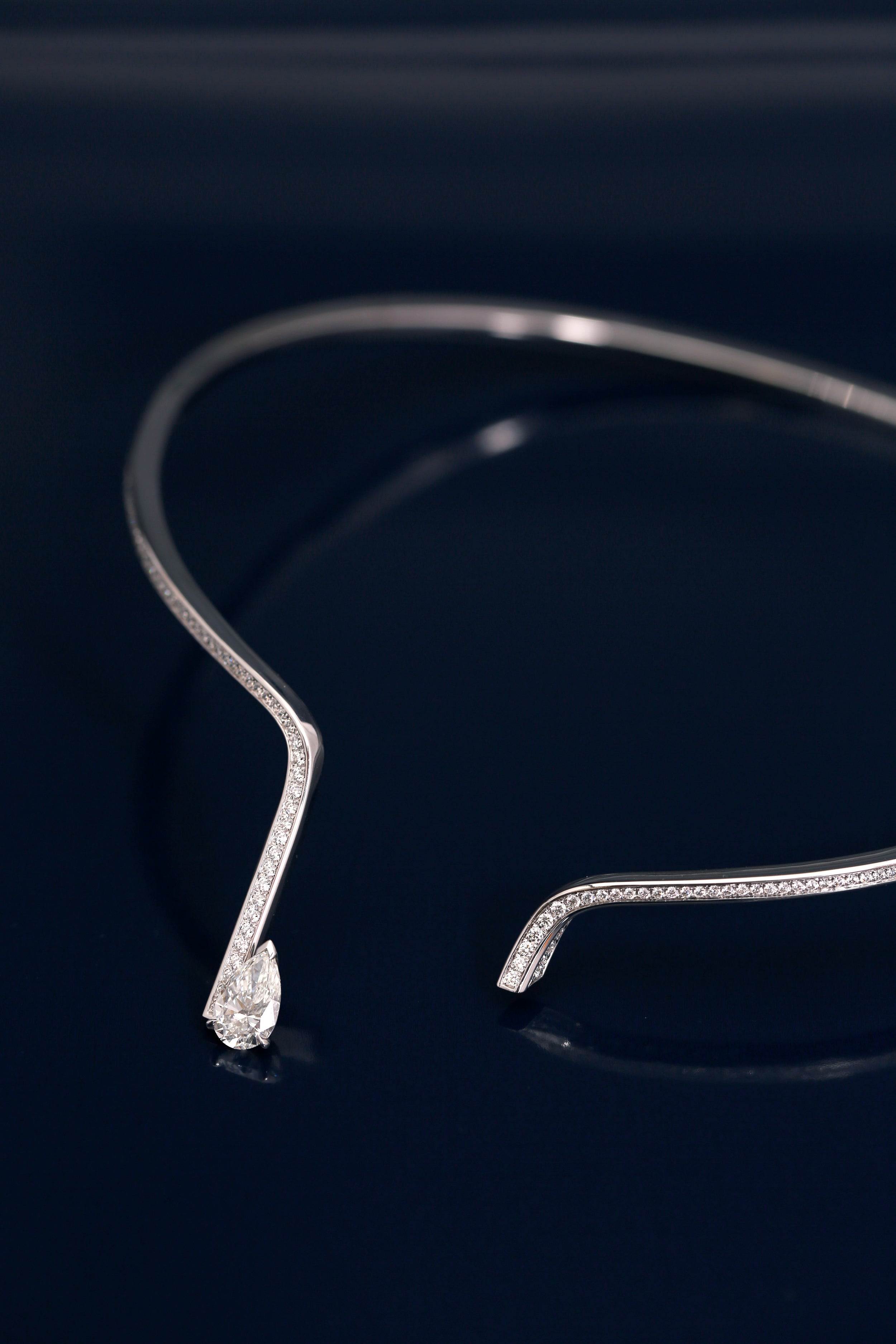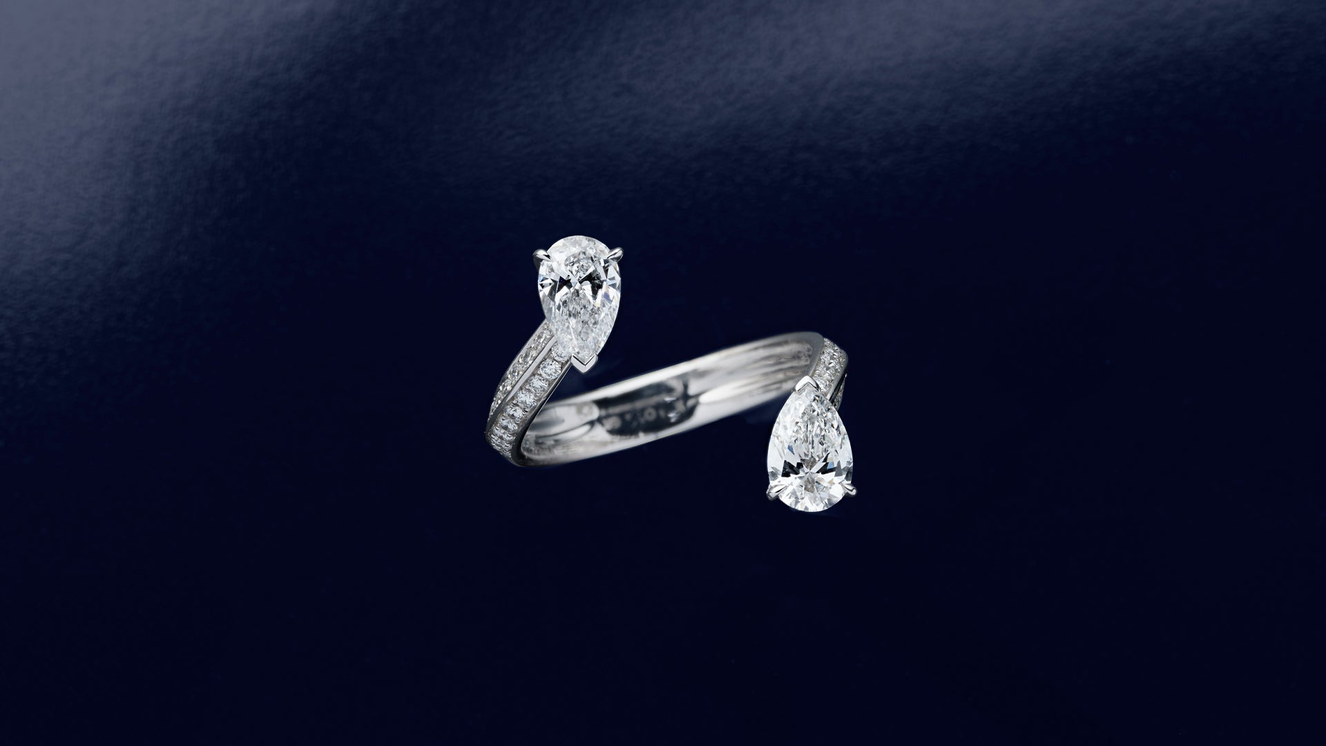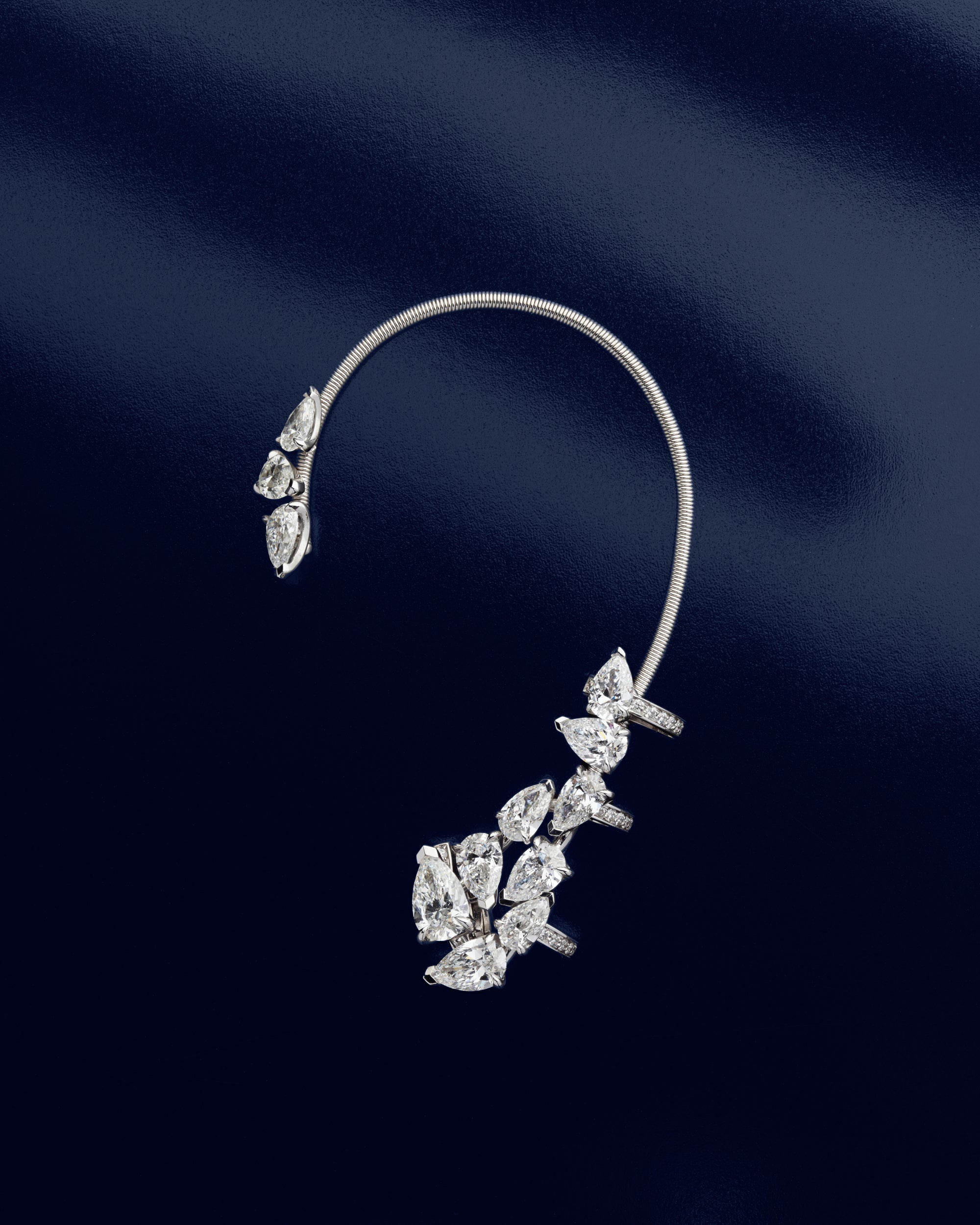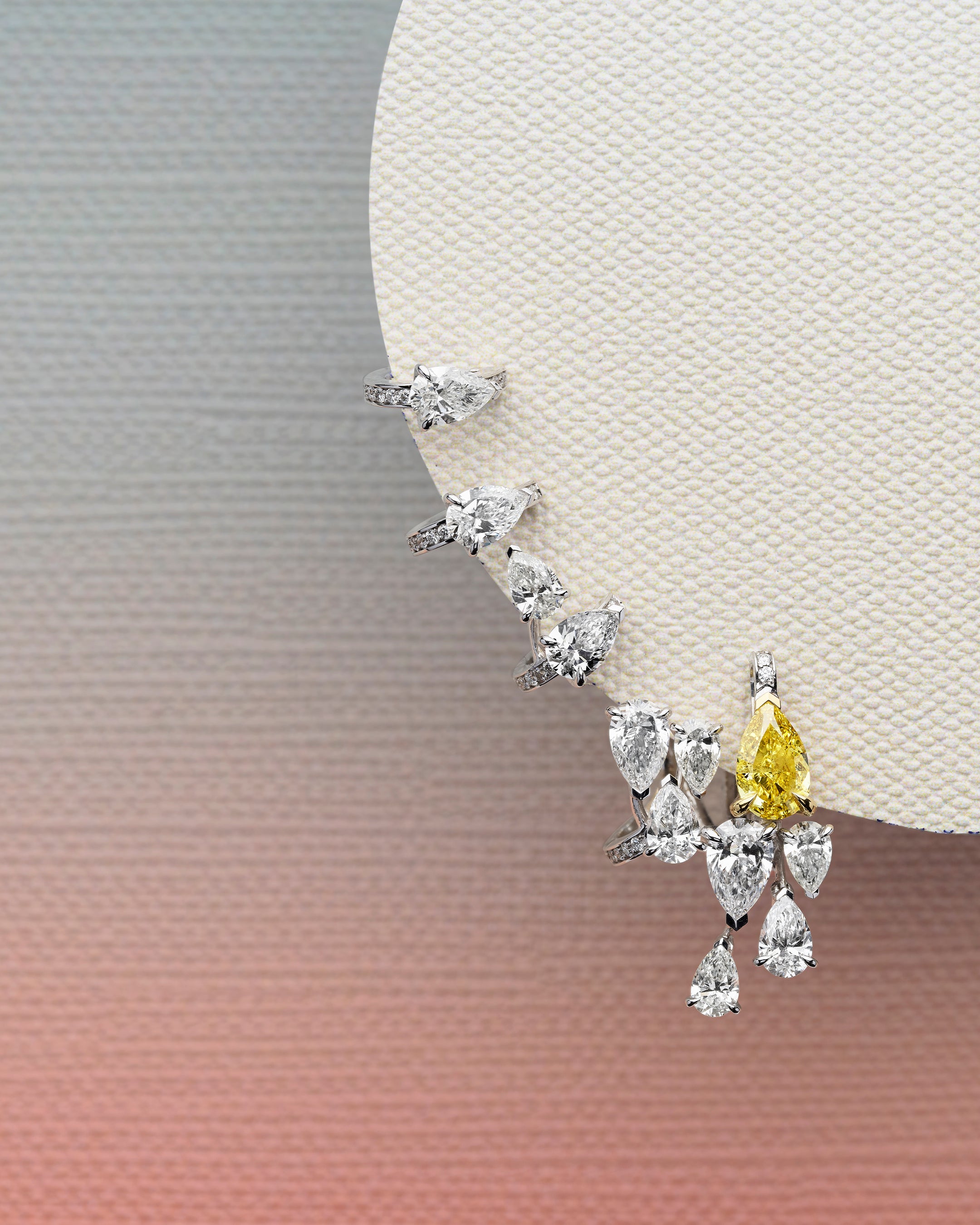 Les plus belles pierres sont soigneusement sélectionnées et mises en scène de manière unique, donnant une illusion de lévitation, grâce à un serti à la forme unique dite « tour Eiffel », témoignant de l’expertise technique de la Maison. Chaque poire est ainsi sélectionnée précisément pour sa forme élancée et ses proportions parfaites, créant une harmonie absolue avec les créations minimalistes aux lignes radicales de la Maison.