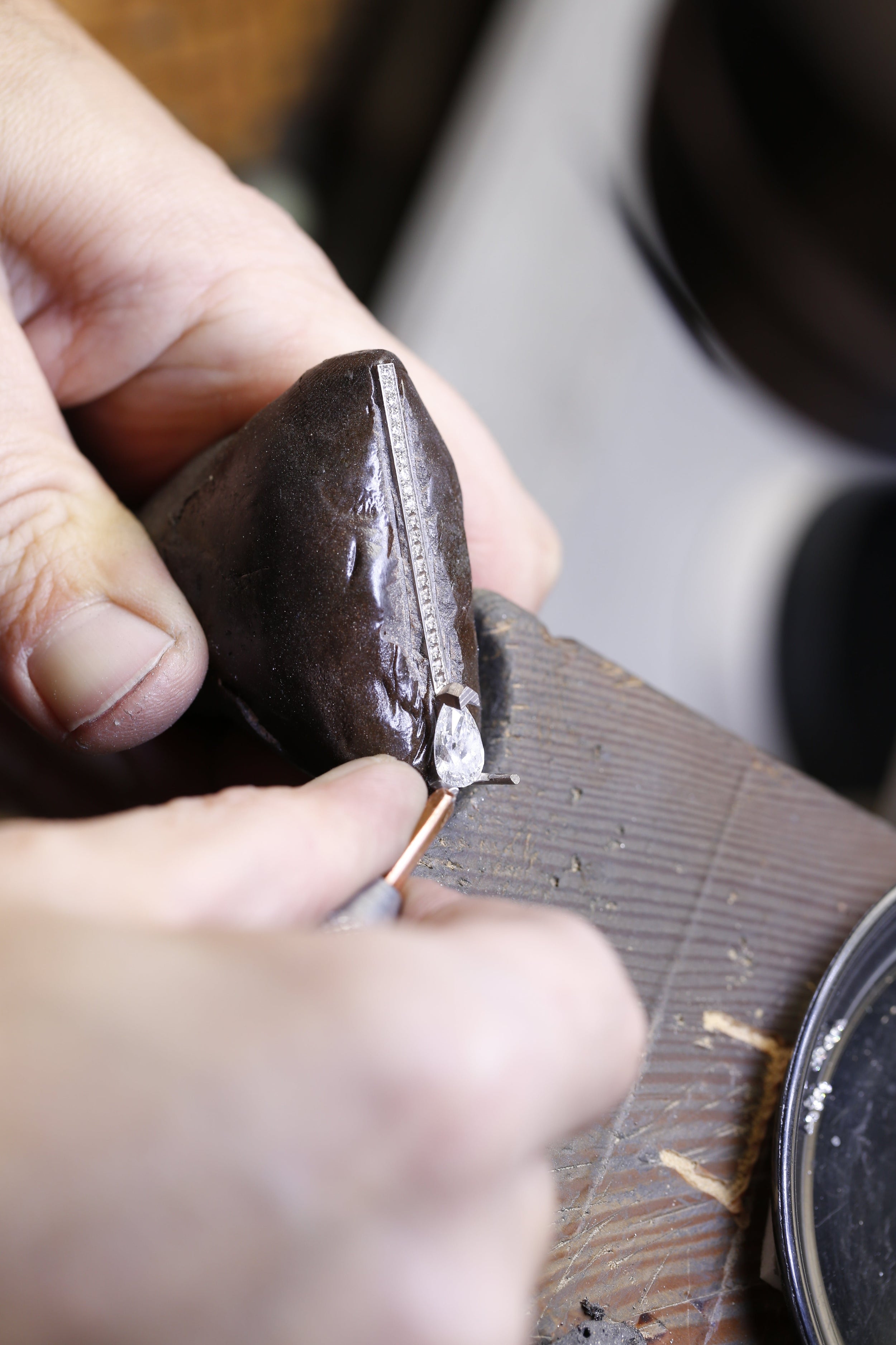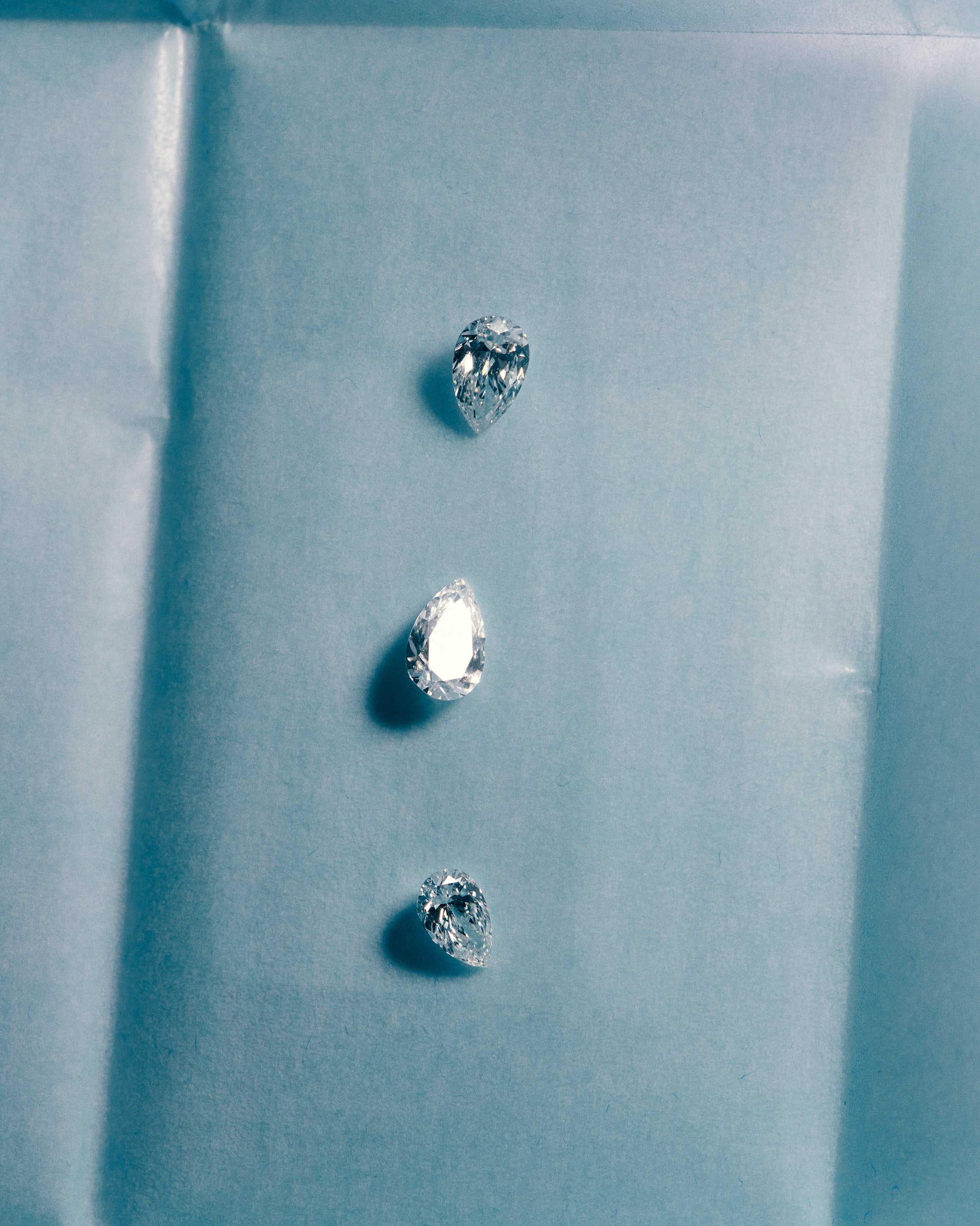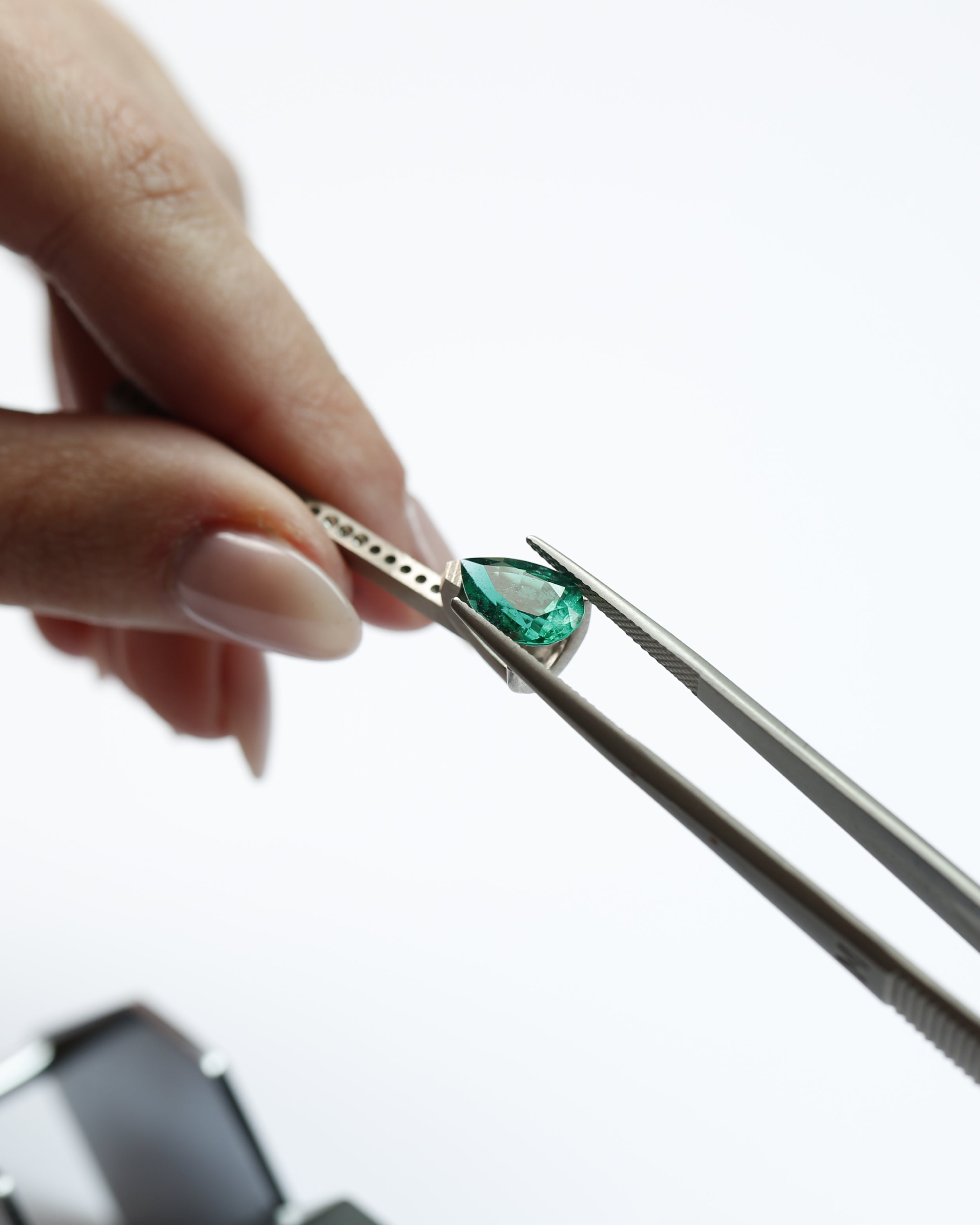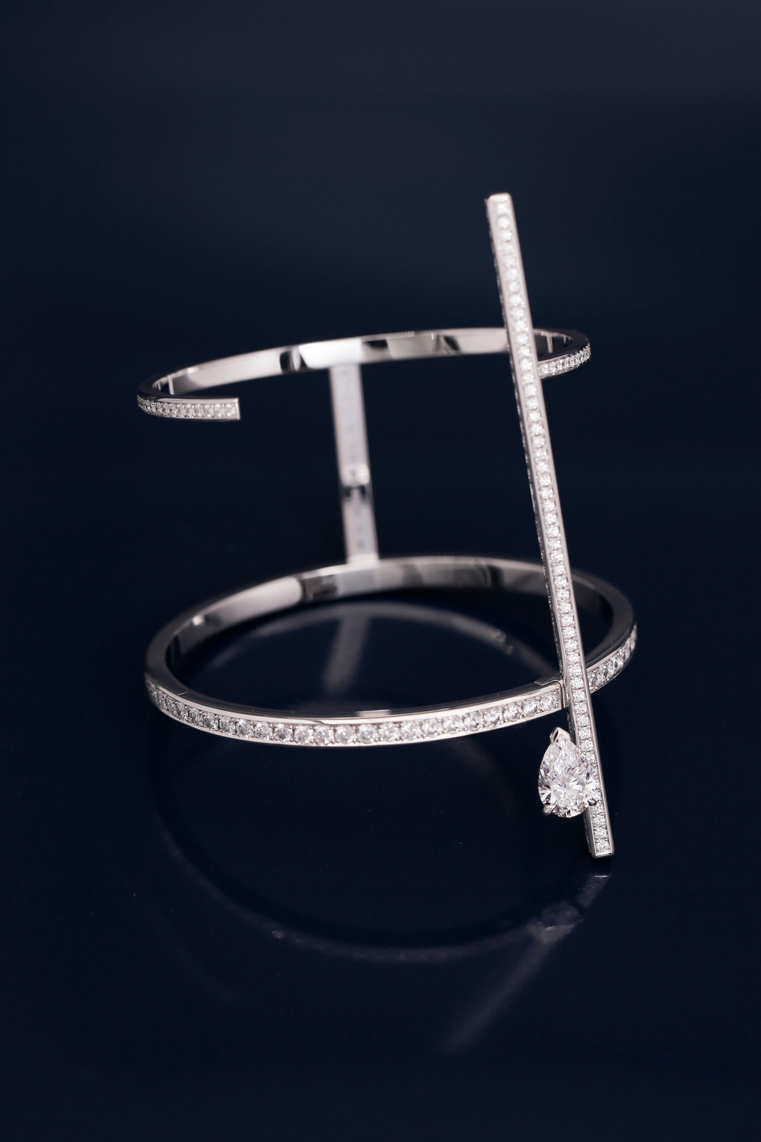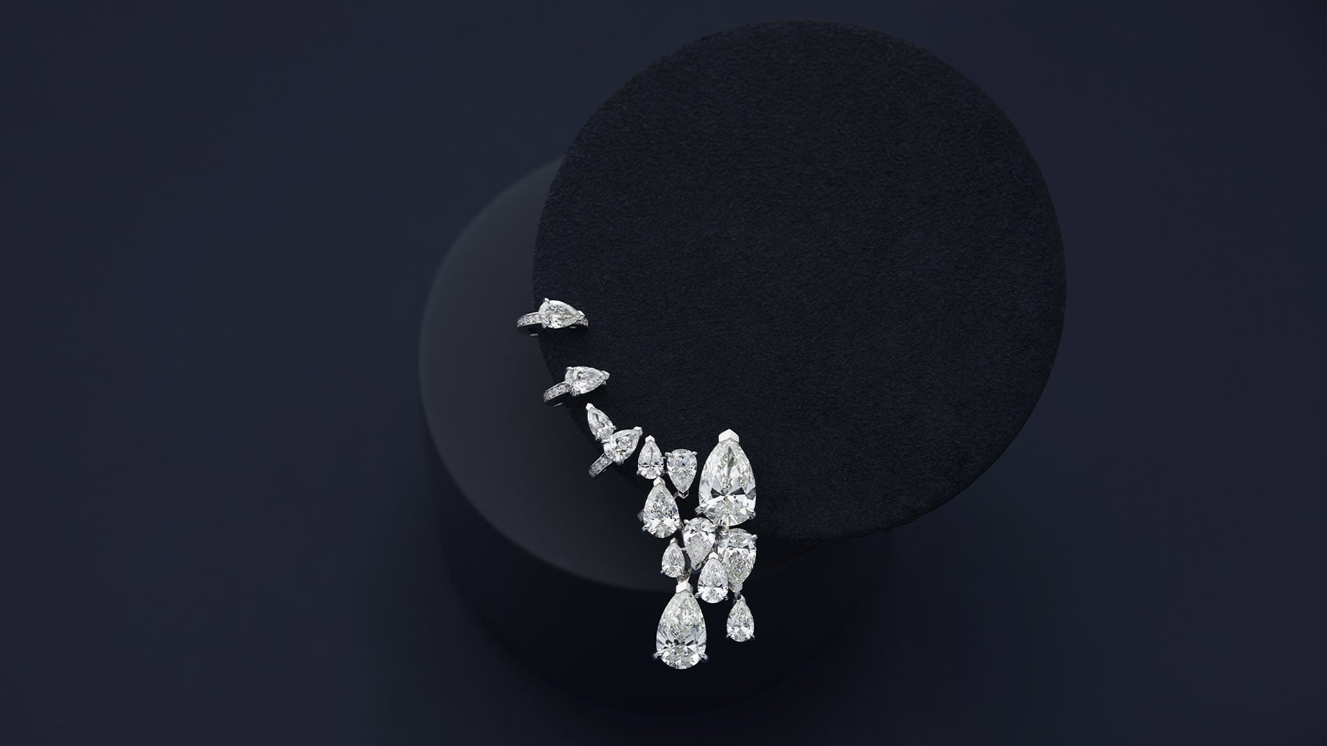 Les plus belles pierres sont soigneusement sélectionnées et mises en scène de manière unique, donnant une illusion de lévitation, grâce à un serti à la forme unique dite « tour Eiffel », témoignant de l’expertise technique de la Maison. Chaque poire est ainsi sélectionnée précisément pour sa forme élancée et ses proportions parfaites, créant une harmonie absolue avec les créations minimalistes aux lignes radicales de la Maison.